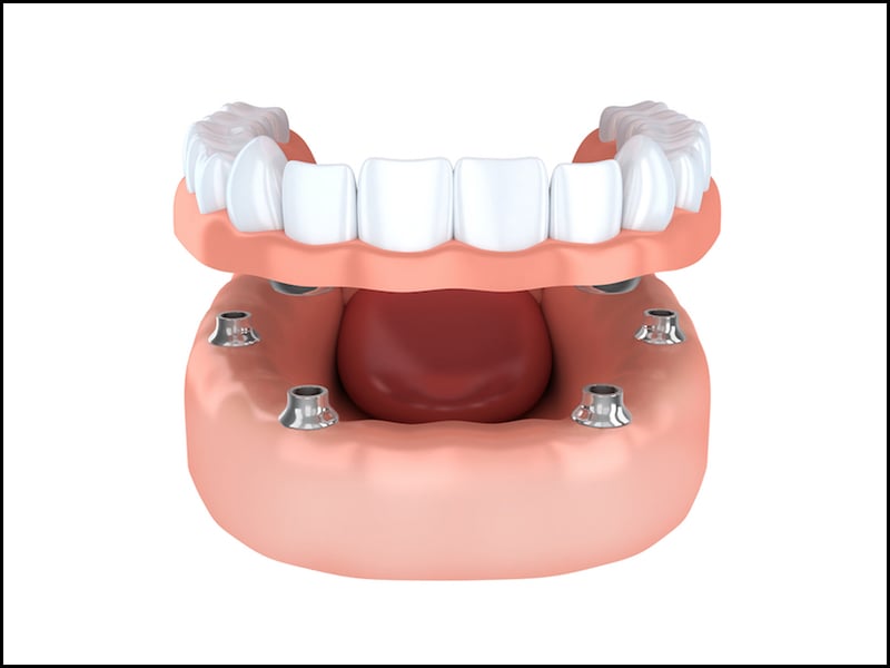 Removable implant dentures (sometimes called snap-in) may require just 4 implants to stabilize the upper arch and just 2 for the lower denture. Removable implant-stabilized dentures can restore up to 90% of chewing ability.